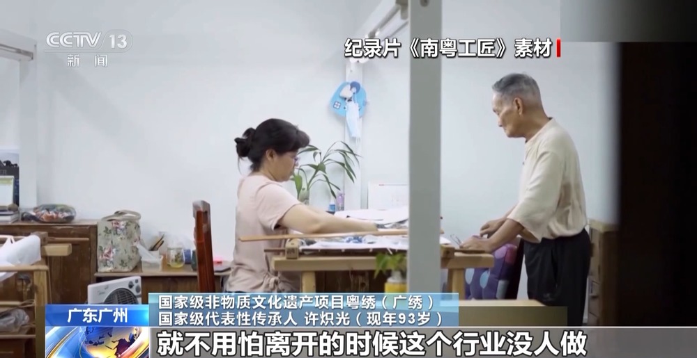 国家级非物质文明遗产项目粤绣(广绣)国家级代表性传承人 许炽光(现年93岁):现在我九十多岁,就不必怕脱离的时分这个职业没人做、没人懂得做。