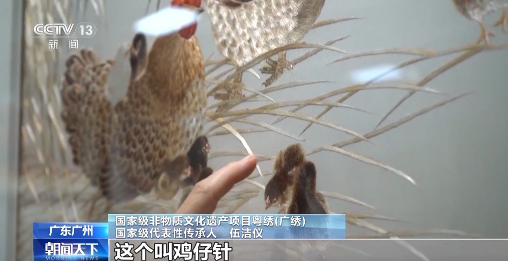 国家级非物质文明遗产项目粤绣(广绣)国家级代表性传承人 伍洁仪:这个叫鸡仔针,由于要凸显每个小鸡都很生动,把毛做得竖起来了,要一种技巧。还有渗针,正面把亮光渗出来。并且每一个荔枝巨细不一致,都是有纹理的。