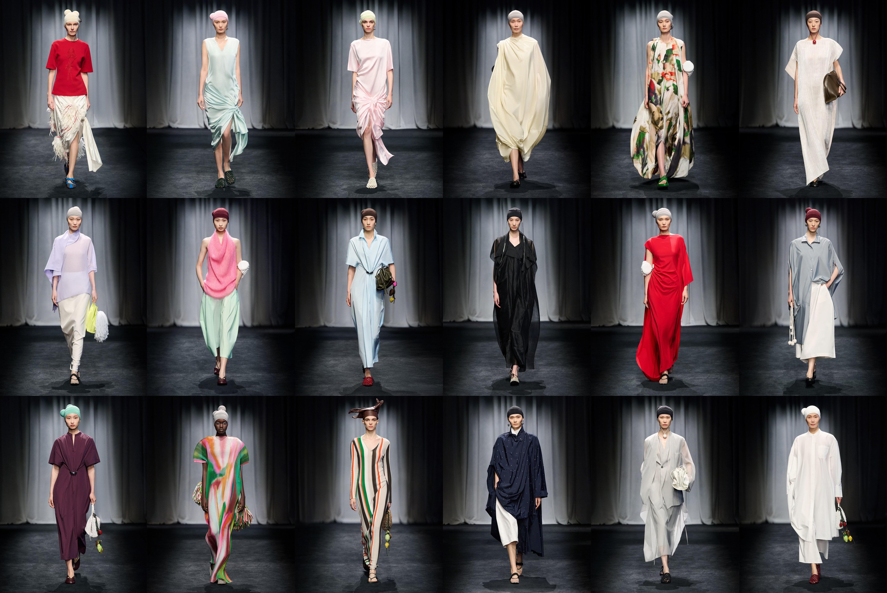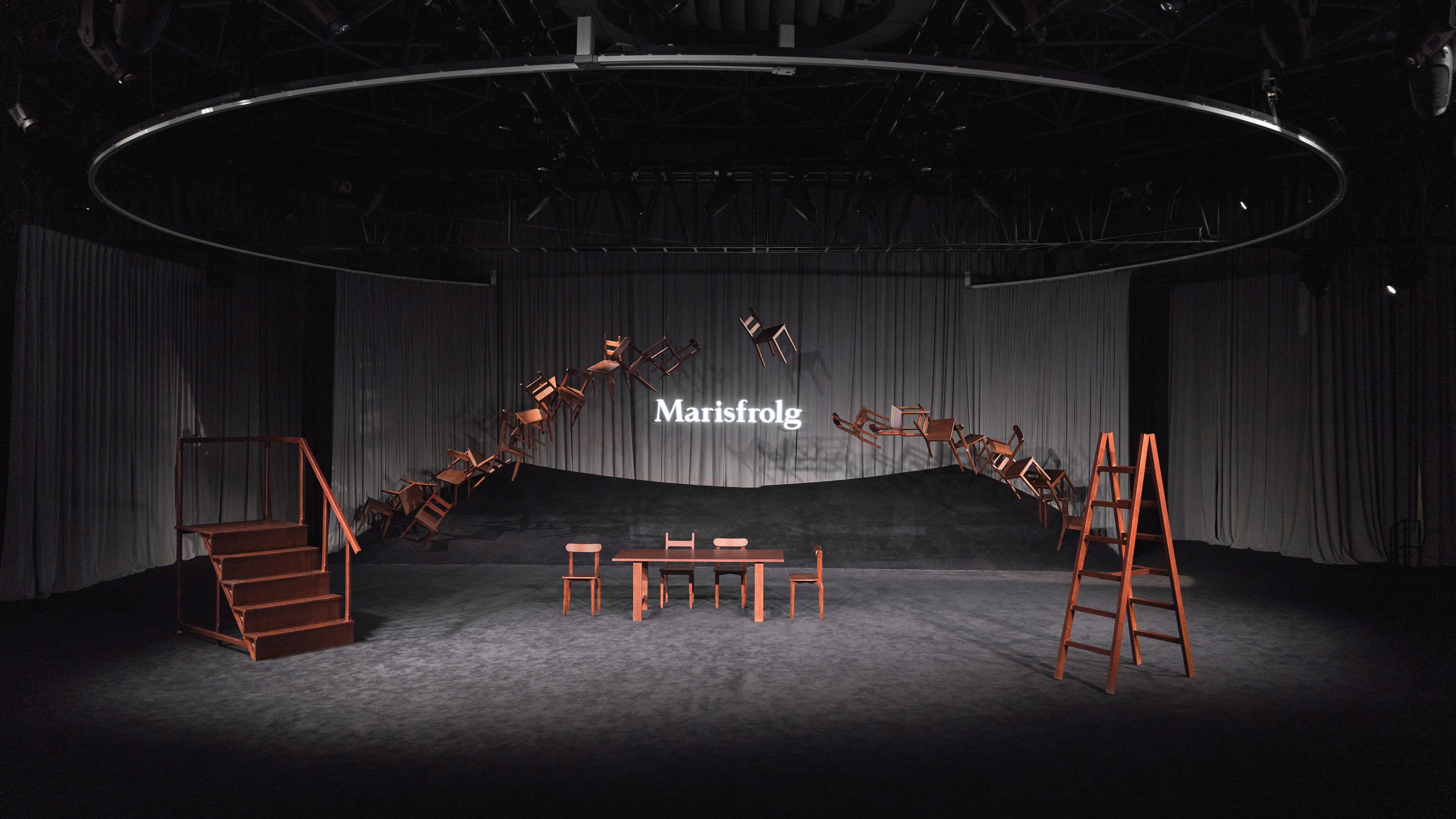 创意源自德国舞蹈家皮娜鲍什(Pina Bausch)所提出的“舞蹈剧场”理念。本季发布中,Marisfrolg 与闻名舞蹈团即兴共创,约请三位女人舞蹈艺术家以剧场办法打开一场探究内涵创意的扮演。